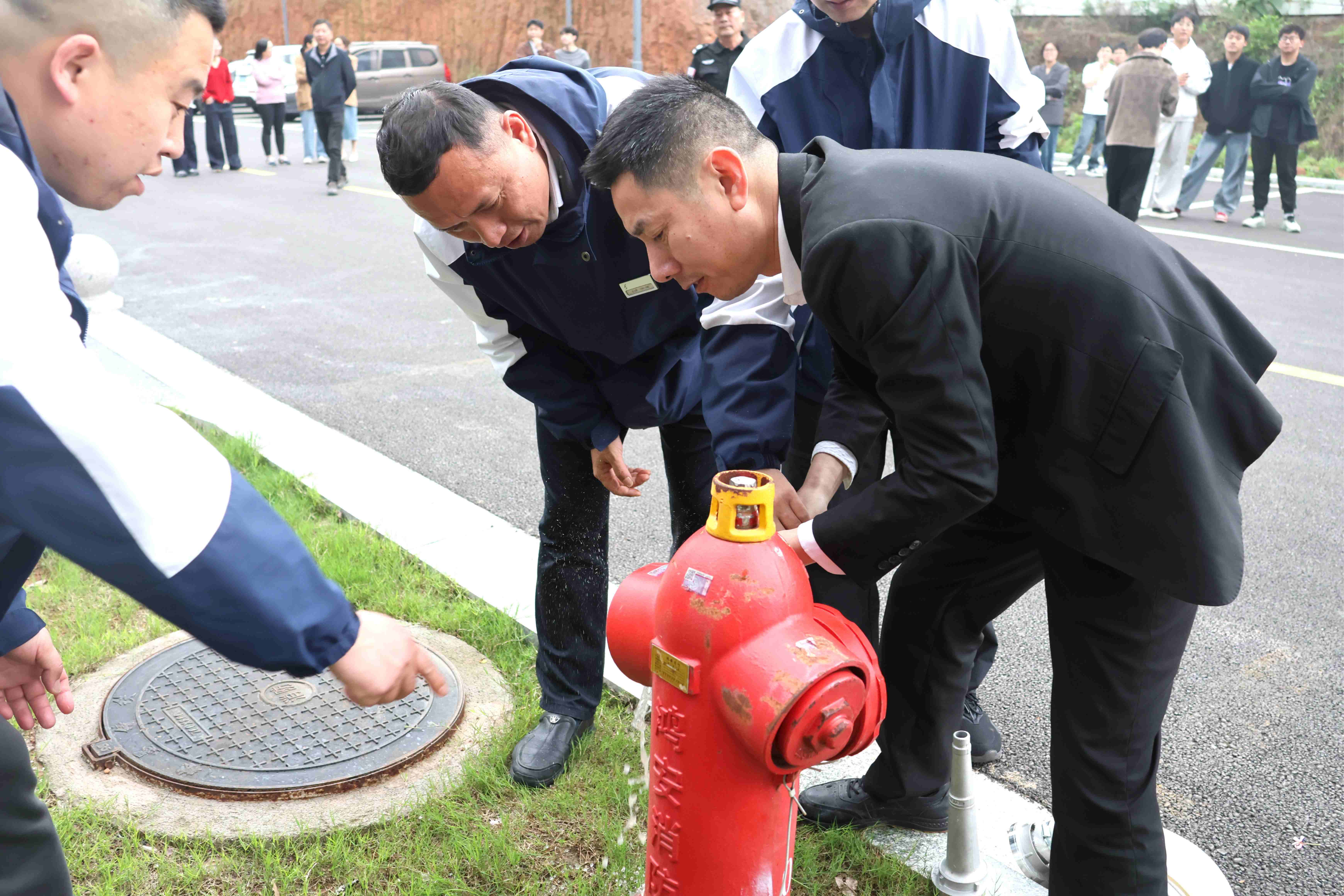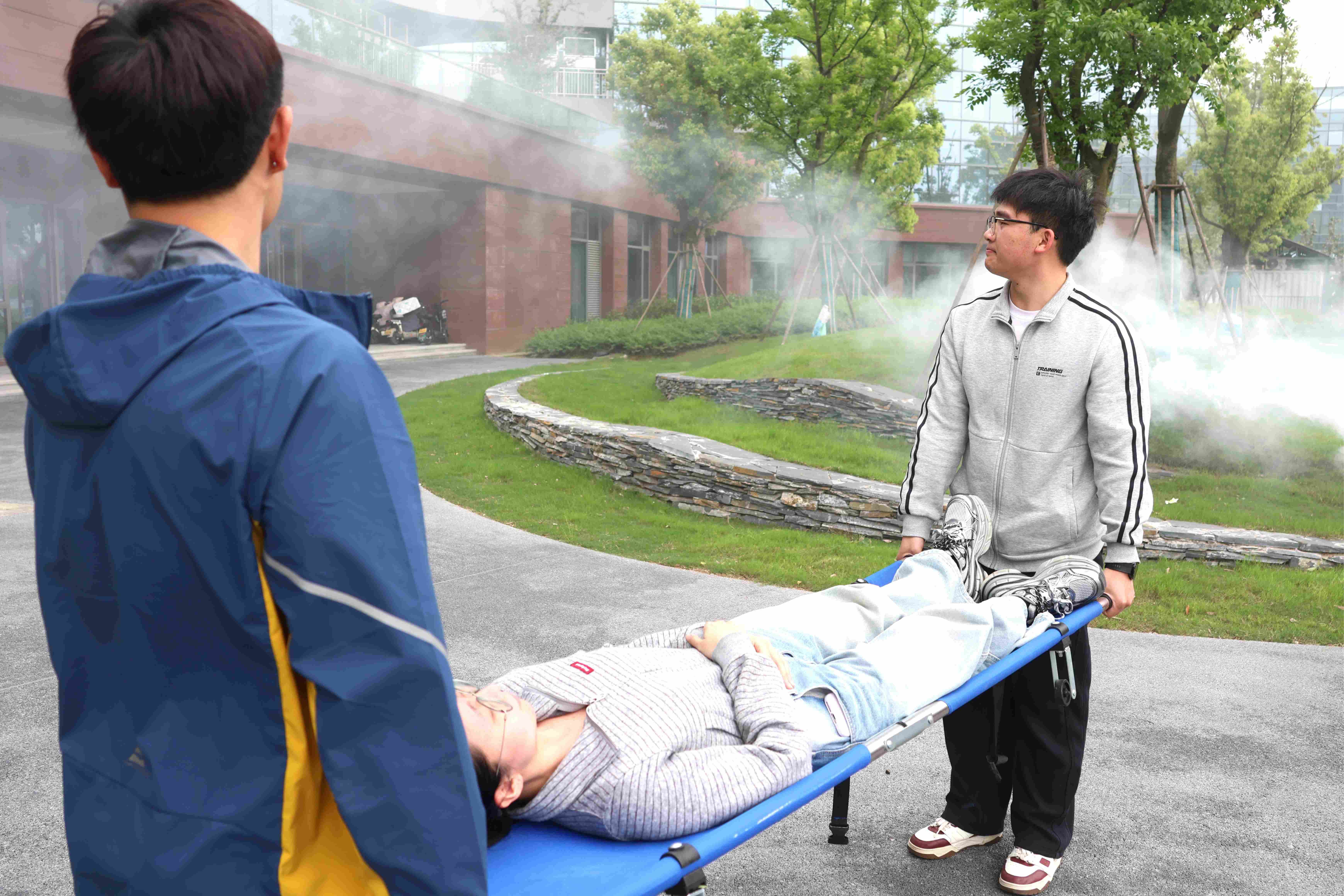 各楼栋疏散负责人分区域值守,引导学生用湿毛巾捂住口鼻、弯腰低姿,沿安全楼梯有序疏散;化工团队急救组同步开展模拟伤员转移演练,高效完成应急救护转移;灭火组人员则快速抵达起火楼层,熟练操作消防水带,规范开展初期火灾扑救演练,全程配合默契、处置规范。