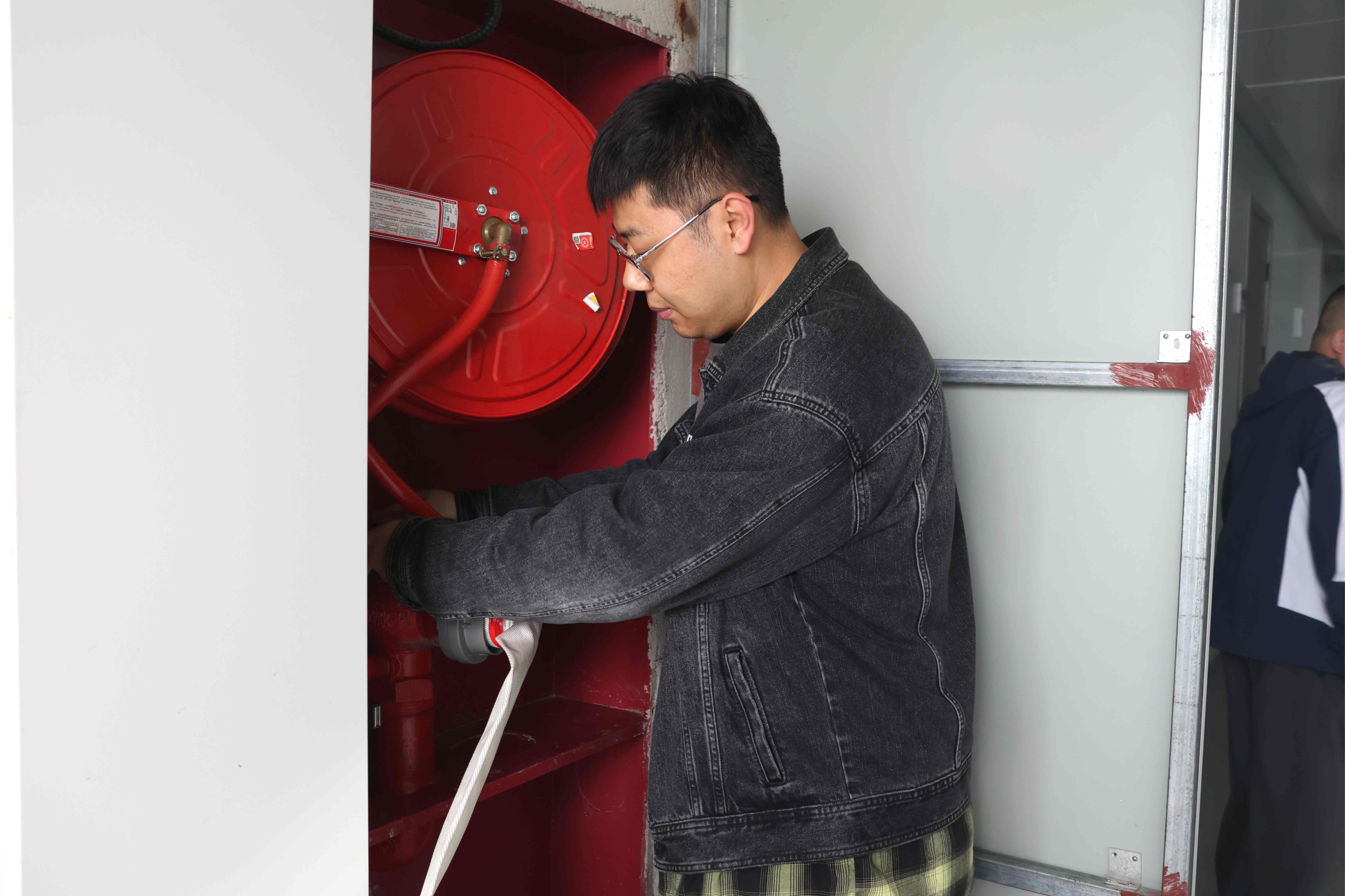 研究院全体人员安全集结至4号楼正门后,现场开展消防实操教学。专业人员向学生们详细讲解并演示消防水带、灭火器的使用方法与操作要点,组织大家逐一实操练习,切实提升全员消防器材实操能力。